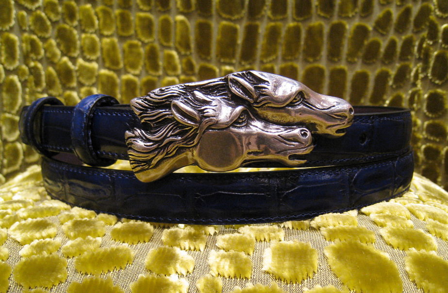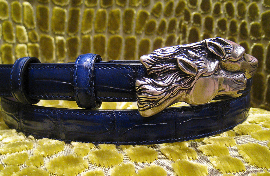 いつもの様にマダムNさまからメールが届きました。今年の年賀状は、干支にちなんで馬のバックルを使いましたがその馬のバックルを気に入って頂きクロップドパンツ用にと。ブルー系を望まれていましたのでダークネイビーのクロコキャリーベを選択。