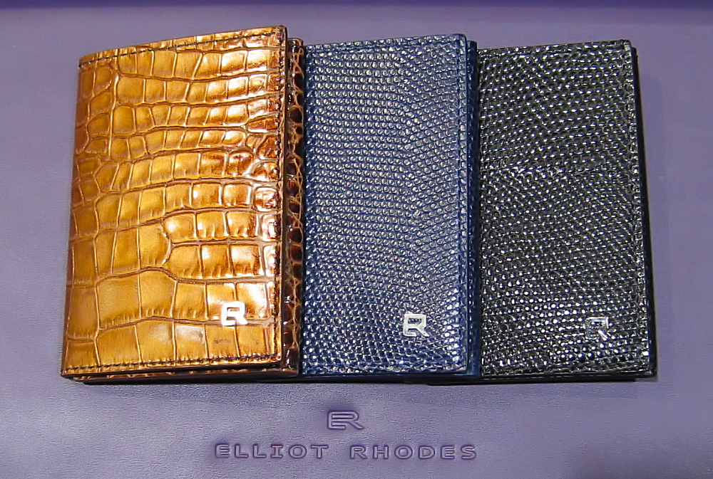 エンボスタイプのゴールド(クロコダイル)、ネイビー、ブラック(リザード)の3色です。