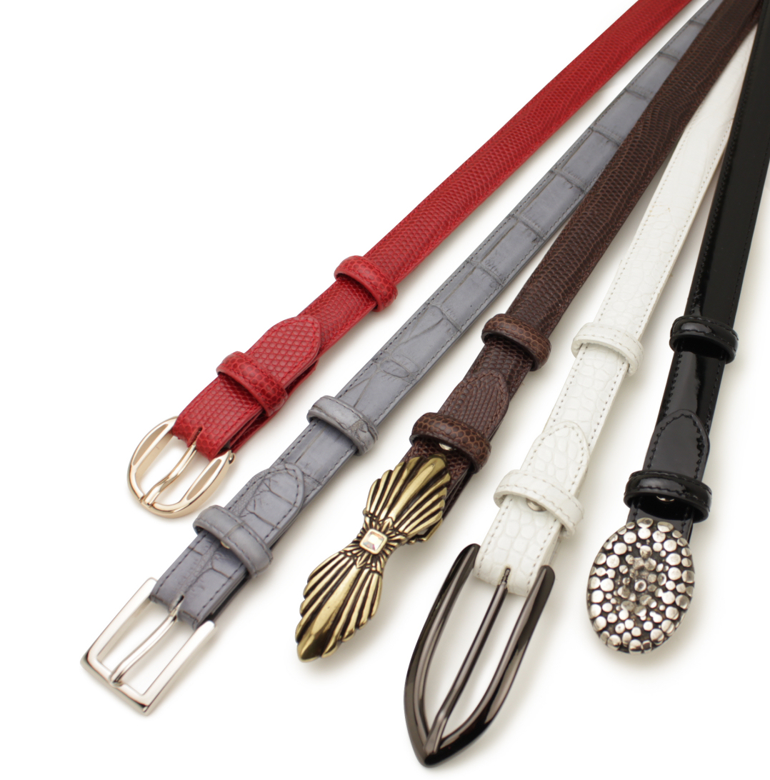 細めのベルトは、バックルをスタイルに合わせるのが基本です。エリオットローズのバックルカラーは、7色あります。Chrome Gold, Antique Gold, Chrome Silver, Antique Silver, Black, Pink Gold, Gun Metal でスタイルの雰囲気やアクセサリーに合わせてバックルを選ぶとコーディネートの格があがります。