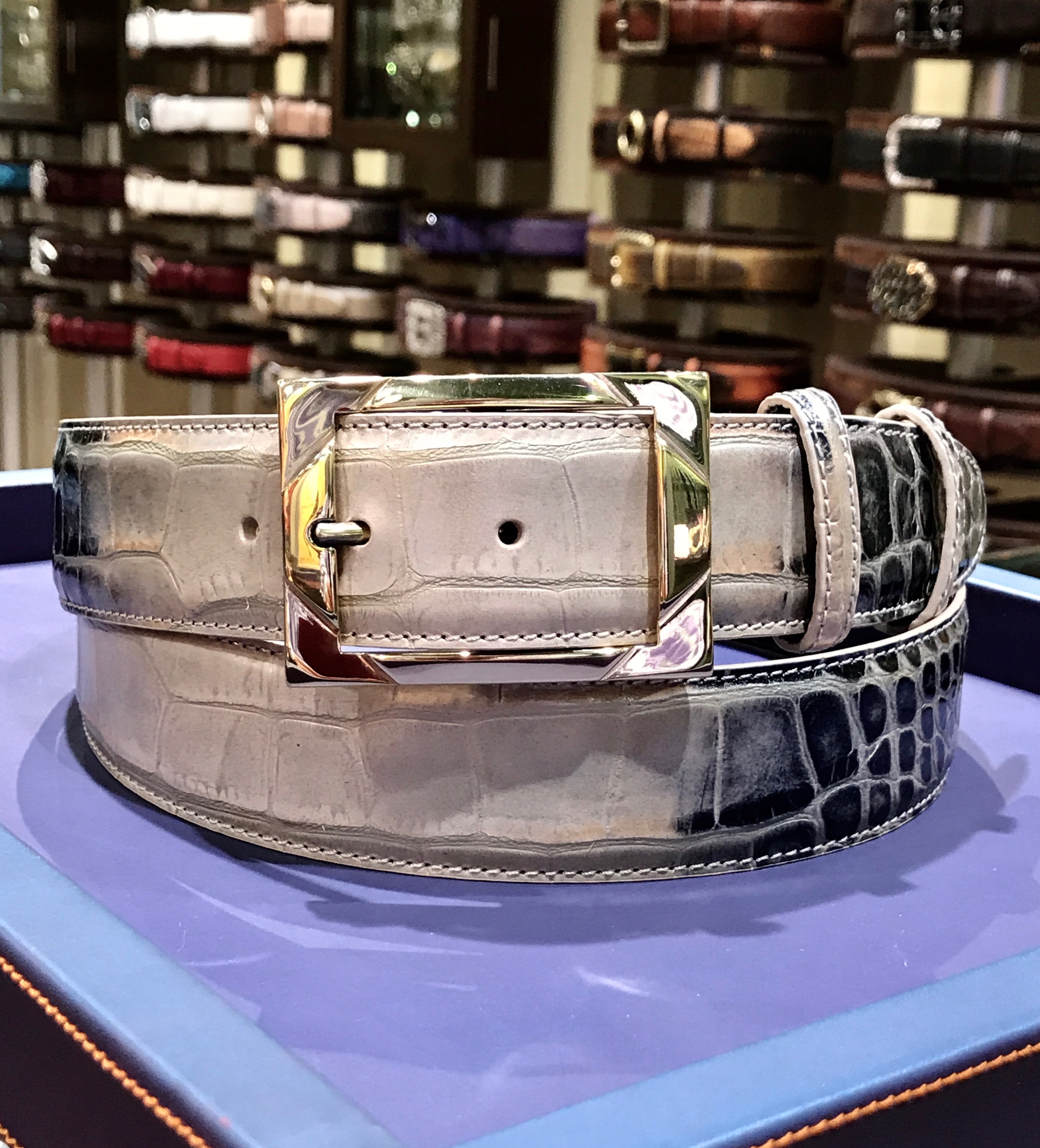 ベージュとチャコールグレーを上手に馴染ませた人気グラデーションストラップです。、ゴールドのバックルを組合わせることで上品さが漂うスタイリッシュなベルトです。着用すると、以外にグレーの方がアクセントになるので嫌な派手さはありません。パールグロスでピカピカな光沢感ではないので、大人のデニムスタイルには最高の1本です。
