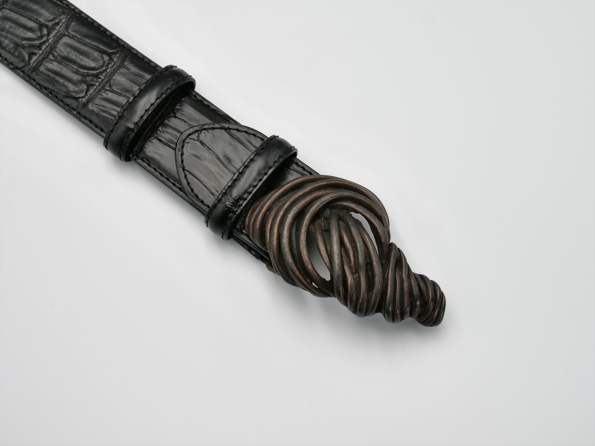 The wire-wrapped design and gold colour give it a worn-in feel, making it unique. We kept the height down to prevent it from looking lumpy and maintained the overall balance. Give your usual denim style a rough and wild look. *Gold colour is also available, so please choose according to your style.