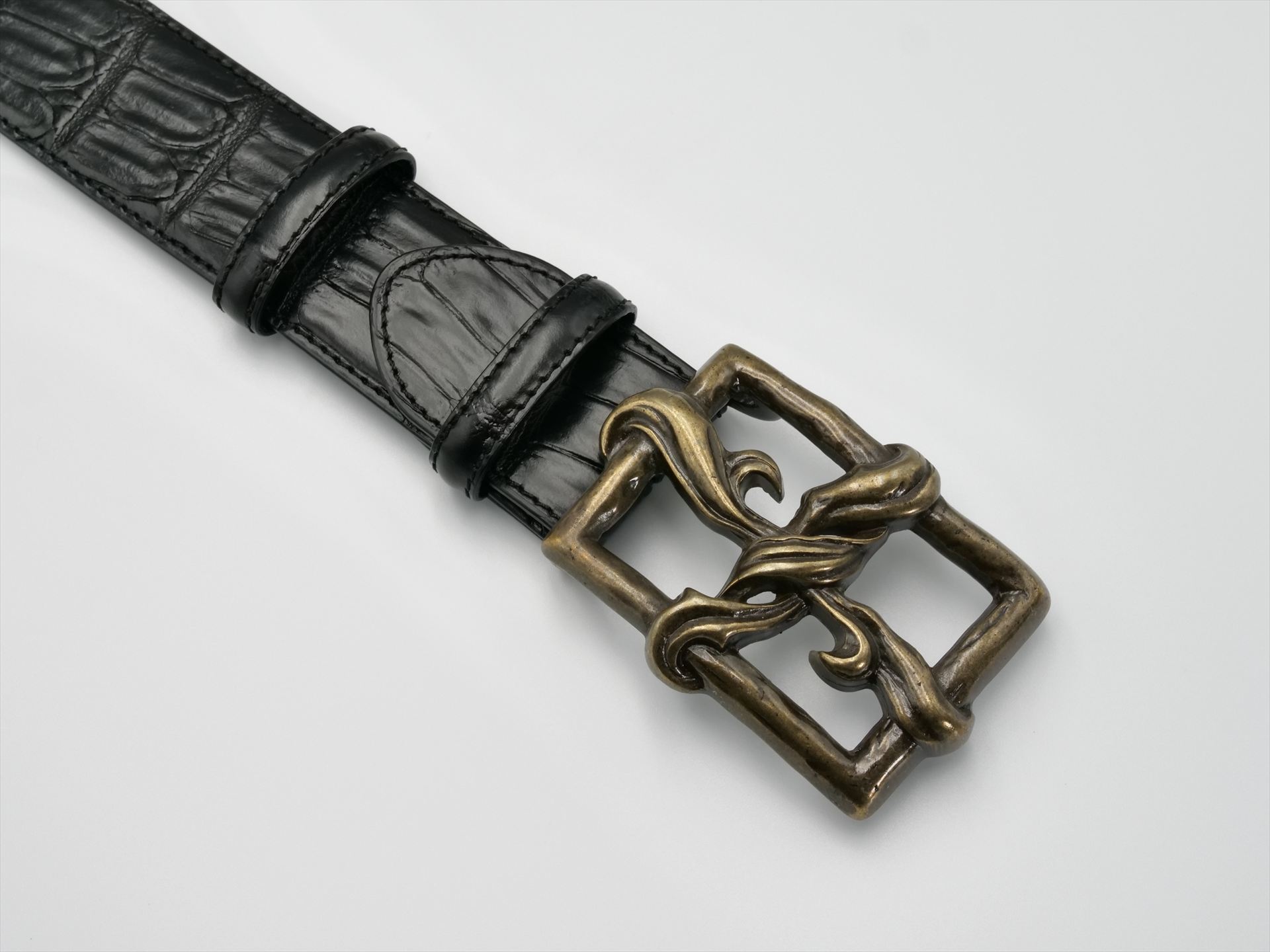 A gold buckle that looks like a hand-carved antique sculpture with a beautiful arabesque motif. The solid design goes well with various straps and can be used for formal and casual occasions. *Antique silver colour is also available, so please choose according to your style.