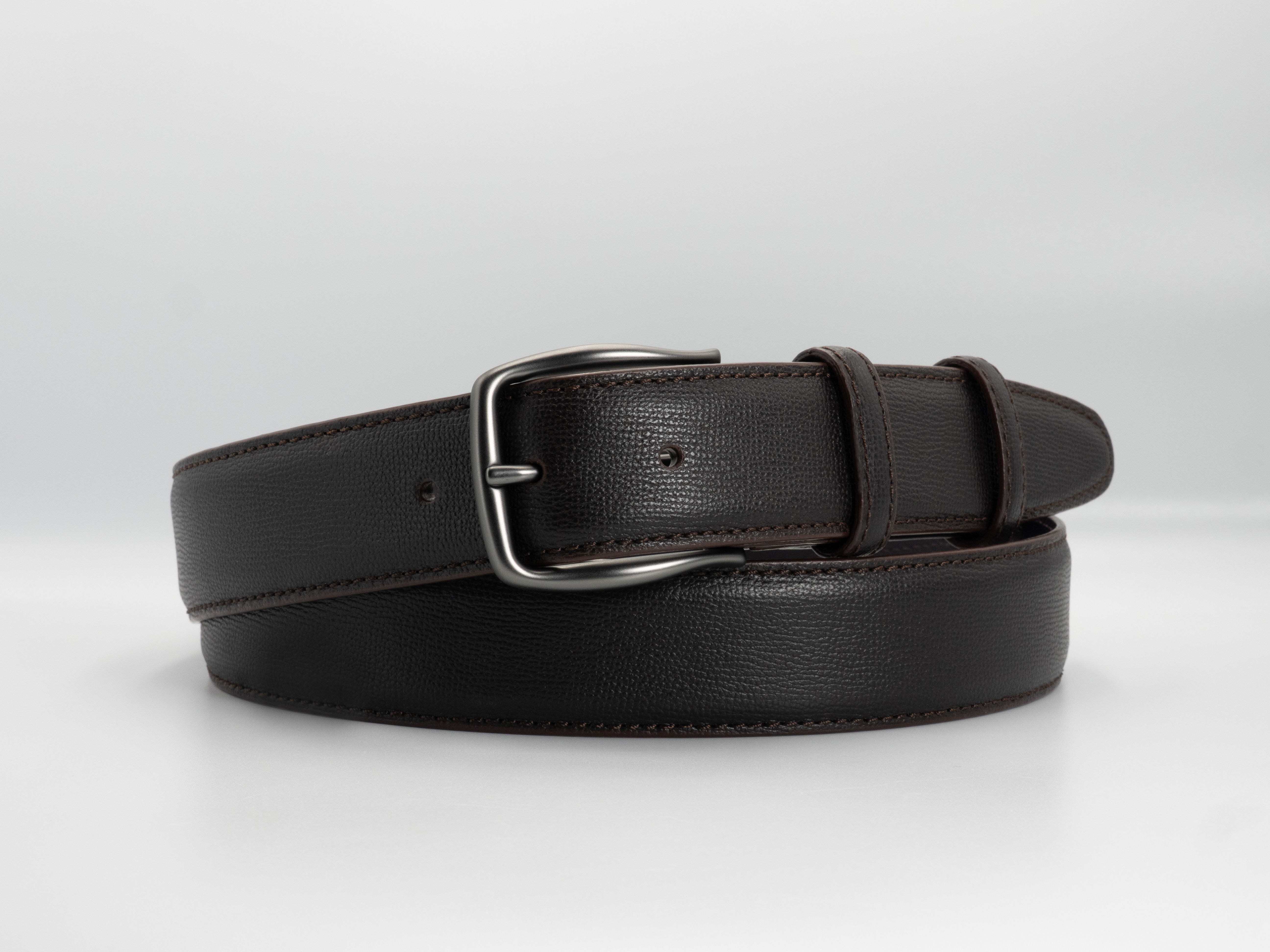 A classic black leather belt with a clean, composed appearance. Made from finely grained leather, it offers a subtle texture that conveys quality without drawing undue attention. The strap has a balanced thickness and firmness, ensuring a secure and comfortable fit.
